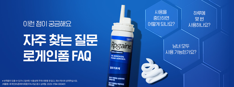 로게인® 폼을 사용하기 시작하면 처음 2~6주안에 일시적인 탈모가 발생할 수 있습니다. 이 쉐딩현상 약 2주동안 진행되며 새로운 머리카락이 자라기 위해 일시적으로 기존 모발이 빠지는 정상의 현상으로, 모발이 휴지기에서 활성 성장단계로 이동하고 있음을 나타냅니다!